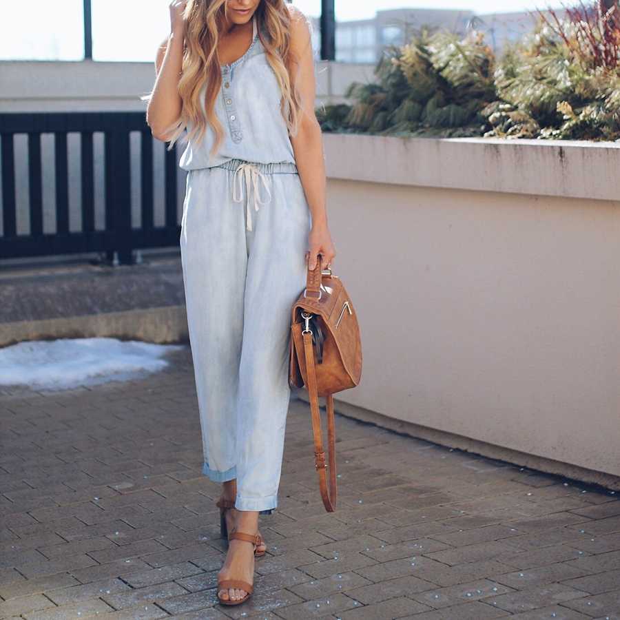 / Casual High Waisted Button Up Drawstring Denim Jumpsuit Playsuits