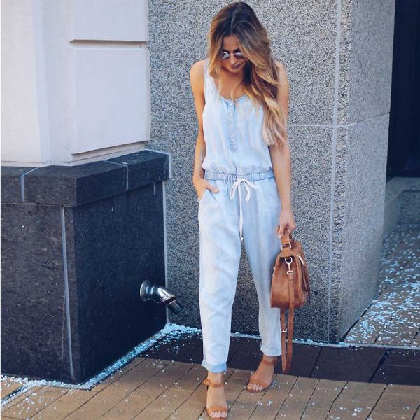 Casual High Waisted Button Up Drawstring Denim Jumpsuit Playsuits