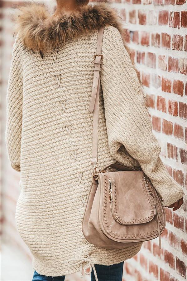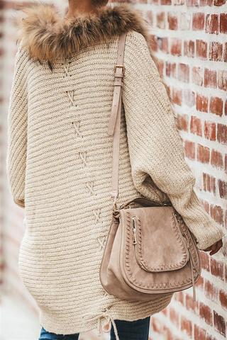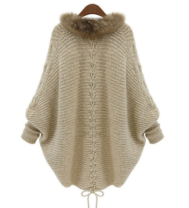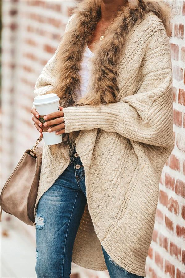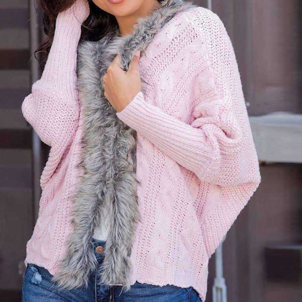 Oversized Furry Fur Collar Trim Batwing Knit Cardigan Sweaters